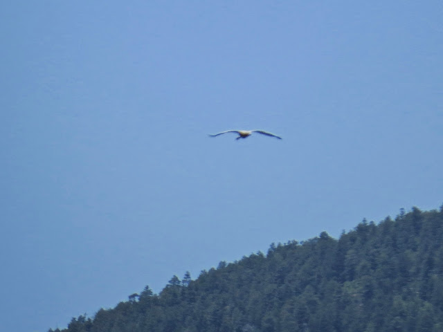 We walked up beyond the dam to the end of the maintained trail and back. At a spot where I could pause with both feet side by side, I looked up and was trying to confirm an ID of an apparent Turkey Vulture. Chris caught on to it and together, we said, ZONE-TAILED HAWK. Note the bi-colored wings of the Zone-tailed that look so much like the Turkey Vulture. The bands on the tail give the "Zonie" away to birders. To small prey on the ground that don't note its slightly smaller size, they think the hawk is a non-threatening vulture. Slyly, cleverly, the Zone-tailed Hawk feeds well with a dive out of a kettle of Turkey Vultures to get its talons into a very surprised smaller bird or vole on the ground.
